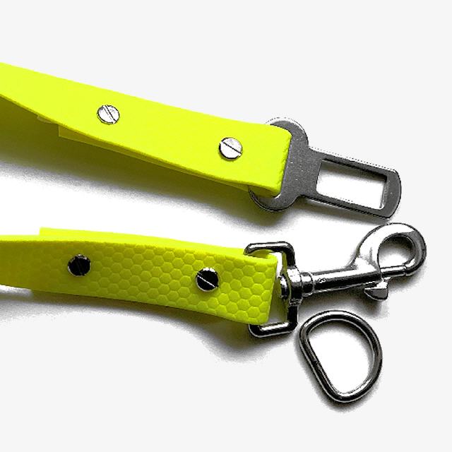 Leine mit Metallschnalle zur Befestigung am Sicherheitsgurt von Fahrzeugen.